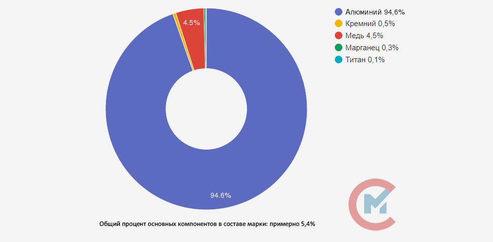 Данный сплав содержит в себе добавки меди (4,5-6 %), кремния (0,5-2,5 %), марганца (0,3-0,8 %), а также титана и кадмия (0,1-0,3 %). Высокое количество меди в составе способствует высокой обрабатываемости резкой и улучшенным механическим свойствам, кремний придает сплаву улучшенные литейные свойства.